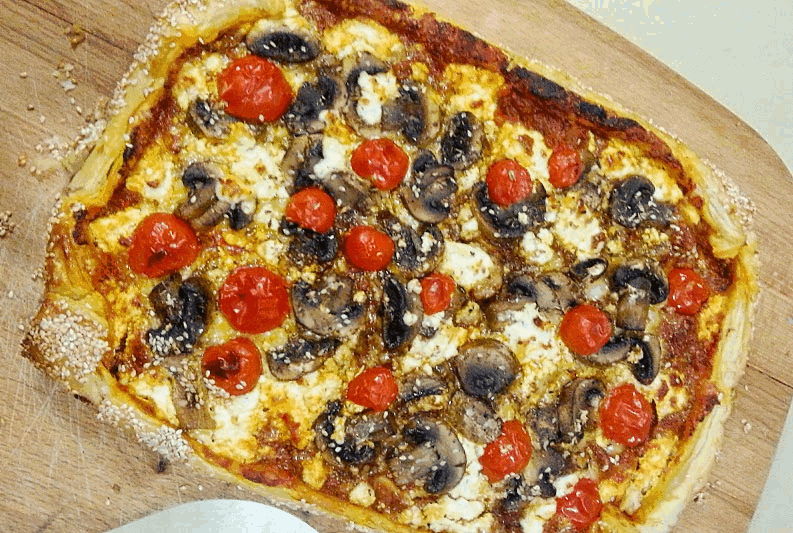 Απλώνουμε την λαδόκολλα πάνω στο ταψί μας και βάζουμε την σφολιάτα και την σάλτσα ντομάτας,απλώνουμε τα κίτρινα τυριά και γύρω γύρω στο φύλλο την φέτα στην μέση βάζουμε τα μανιτάρια και διάσπαρτα εδώ και εκεί τα ντοματίνια. Αφήνουμε δύο εκατοστά γύρω από το φύλλο για να κλείσουμε την μανιταρόπιτα. Περνάμε με αβγό την σφολιάτα και βάζουμε σουσάμι. Στο τέλος ρίχνουμε από πάνω ρίγανη και έξτρα σουσάμι, για τη γεύση!