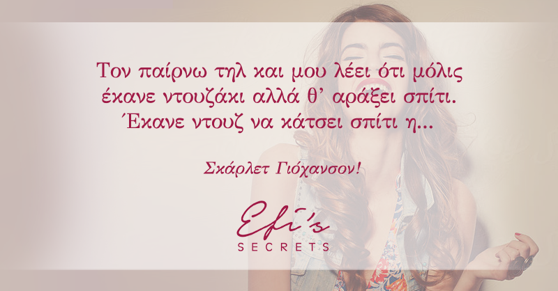 Quotes #302 Quotes #302: Τον παίρνω τηλ και μου λέει ότι μόλις έκανε ντουζάκι αλλά θ’ αράξει σπίτι. Έκανε ντουζ να κάτσει σπίτι η… Σκάρλετ Γιοχανσον! Comments comments