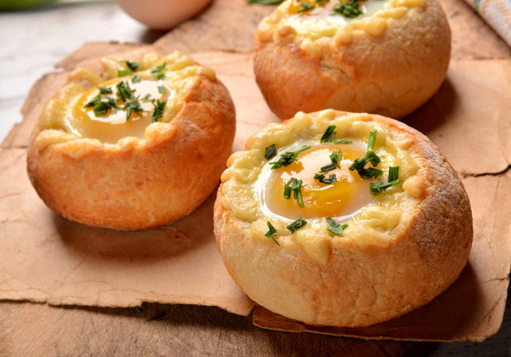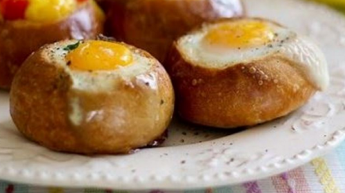 Ένα αυγό αντιστοιχεί σε ένα ψωμάκι. Για όσους επιθυμούν προσθέτουν το μπέικον πριν σπάσουν το αυγό. Τοποθετείτε τα ψωμάκια σε ταψί με αντικολλητικό χαρτί ψήνετε στους 200 για 1′.