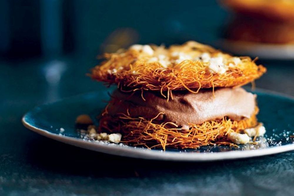 Ανοίγουμε το κανταΐφι με τα χέρια, το βάζουμε σε ένα τηγάνι και το καβουρδίζουμε. Λιώνουμε τις κουβερτούρες σε μπεν μαρί ή στο φούρνο μικροκυμάτων. Βάζουμε τους ξηρούς καρπούς στο μπλέντερ και τα κόβουμε σε μεσαία κομμάτια. Σε ένα πυρέξ ανακατεύουμε το κανταΐφι με τις κουβερτούρες και τους ξηρούς καρπούς. Βάζουμε το μείγμα σε ποτηράκι για να πάρει σχήμα και το αναποδογυρίζουμε σε ένα πιάτο. Τα βάζουμε στο ψυγείο για να σφίξουν και γαρνίρουμε με ξηρούς καρπούς. Έτοιμα!