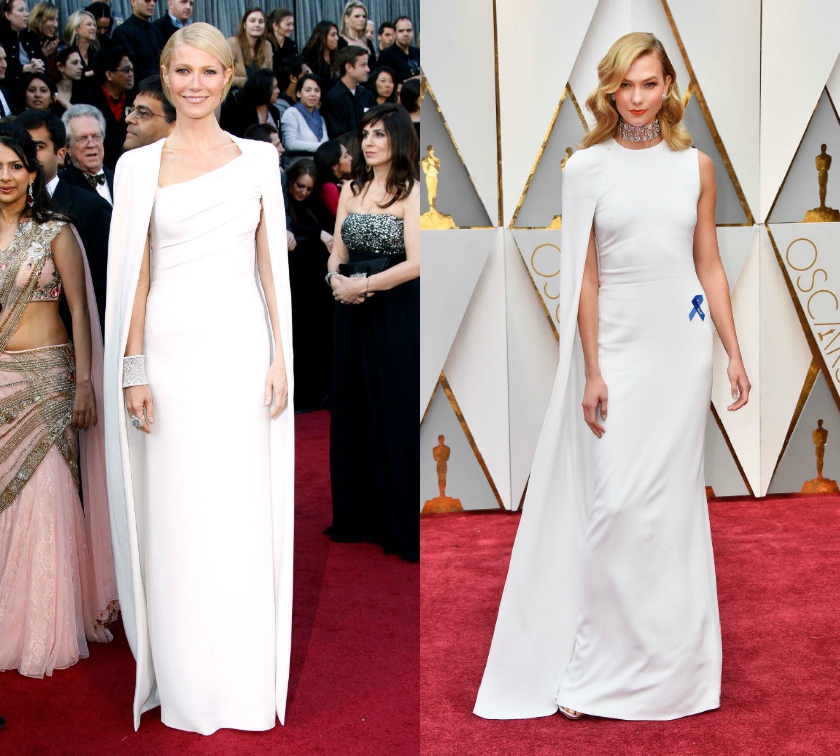 H Gwyneth Paltrow με το πρώτο «cape dress» στην ιστορία του θεσμού, το 2012, δια χειρός Tom Ford. H Karlie Kloss, φέτος 5 χρόνια μετά, με παρόμοιο φόρεμα Stella McCartney.