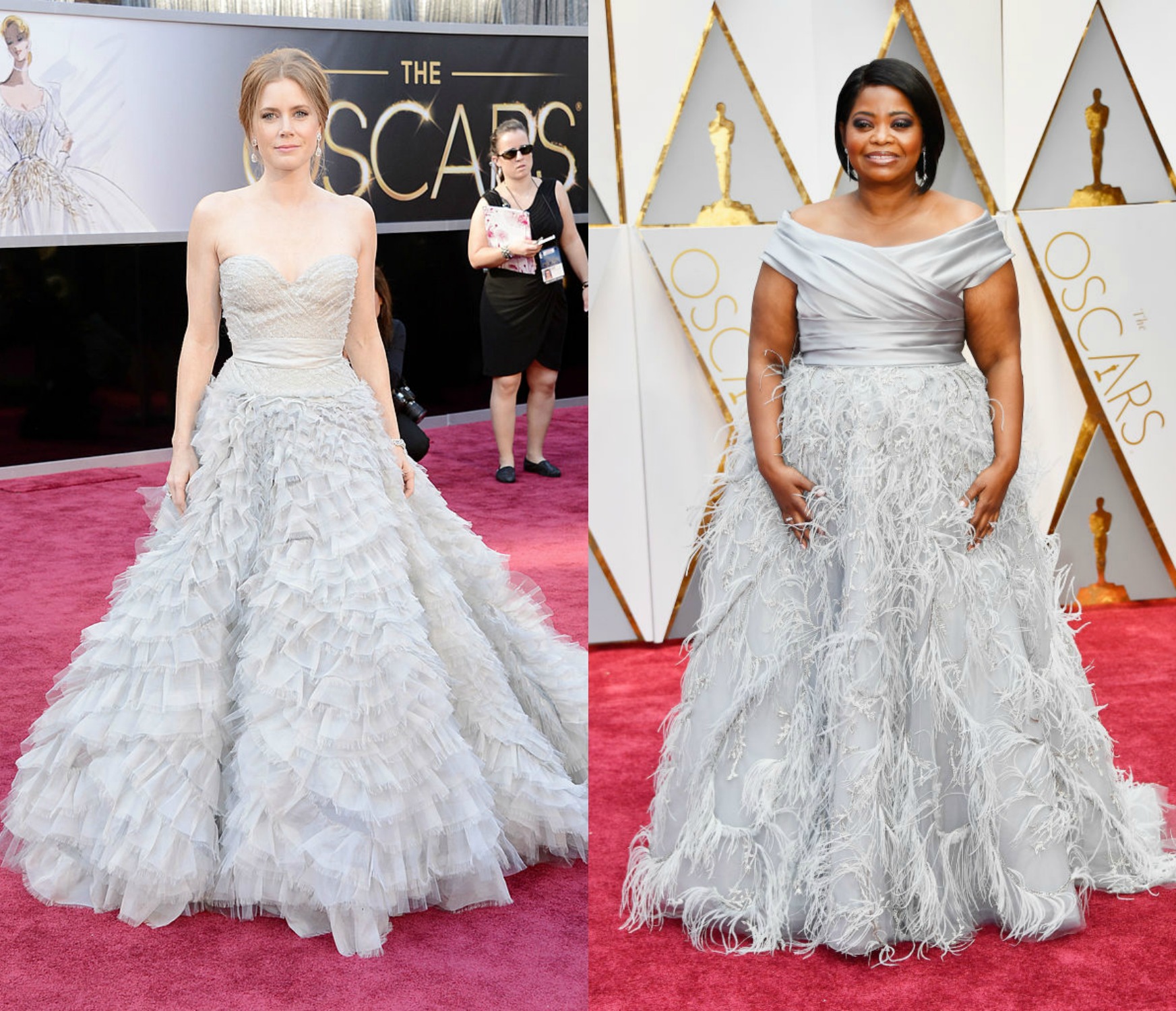H Amy Adams Φόρεσε αυτό το Oscar de la Renta, μοβ τούλινο φόρεμα στην τελετή των Βραβείων Όσκαρ το 2013. Φέτος έβαλε ένα παρόμοιο του οίκου Marchesa, η Octavia Spencer.