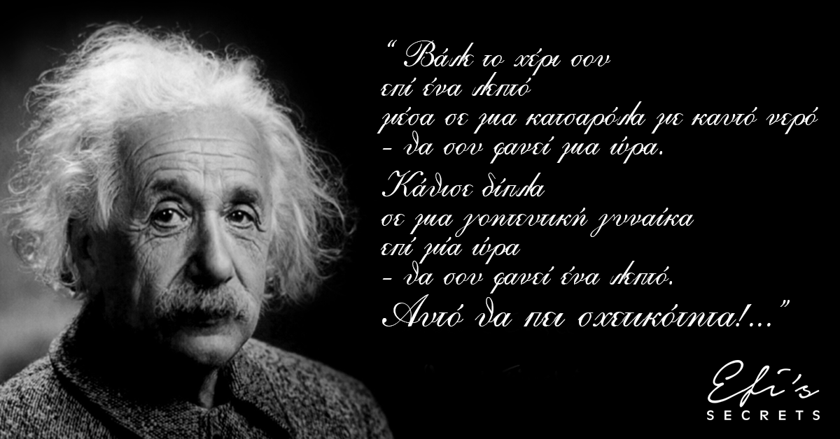Βάλε το χέρι σου επί ένα λεπτό μέσα σε μια κατσαρόλα με καυτό νερό – θα σου φανεί μια ώρα. Κάθισε δίπλα σε μια γοητευτική γυναίκα επί μία ώρα – θα σου φανεί ένα λεπτό. Αυτό θα πει σχετικότητα!