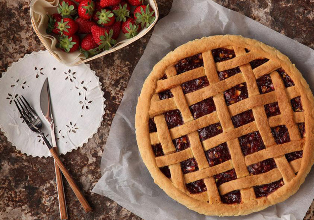 Υλικά για την πάστα φλώρα με γέμιση μαρμελάδα φράουλα και φιστίκια Αιγίνης