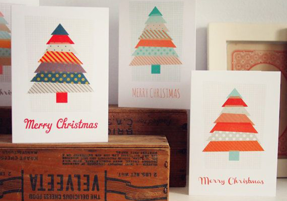 Ξεκινάμε με απλές χειροποίητες Χριστουγεννιάτικες κάρτες που θα χρειαστείς λωρίδες από παλιές εφημερίδες, λωρίδες τσόχας ή washi tape και ένα αστεράκι στην κορυφή.